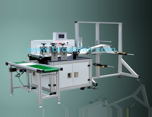 布料切片机用于杯型口罩布料的裁切,仅需一名操作员将布料放置于料架上,机器自动将布料切断并堆叠好